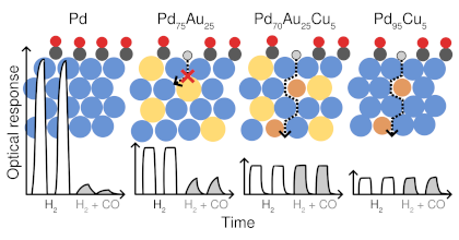 Due to their ability to reversibly absorb/desorb hydrogen without hysteresis, Pd–Au nanoalloys have been proposed as materials for hydrogen sensing. For sensing, it is important that absorption/desorption isotherms are reproducible and stable over time. A few studies have pointed to the influence of short and long range chemical order on these isotherms, but many aspects of the impact of chemical order have remained unexplored. Here, we use alloy cluster expansions to describe the thermodynamics of hydrogen in Pd–Au in a wide concentration range. We investigate how different chemical orderings, corresponding to annealing at different temperatures as well as different external pressures of hydrogen, impact the behavior of the material with focus on its hydrogen absorption/desorption isotherms. In particular, we find that a long-range ordered L12 phase is expected to form if the H2 pressure is sufficiently high. Furthermore, we construct the phase diagram at temperatures from 250 K to 500 K, showing that if full equilibrium is reached in the presence of hydrogen, phase separation can often be expected to occur, in stark contrast to the phase diagram in para-equilibrium. Our results explain the experimental observation that absorption/desorption isotherms in Pd–Au are often stable over time, but also reveal pitfalls for when this may not be the case.